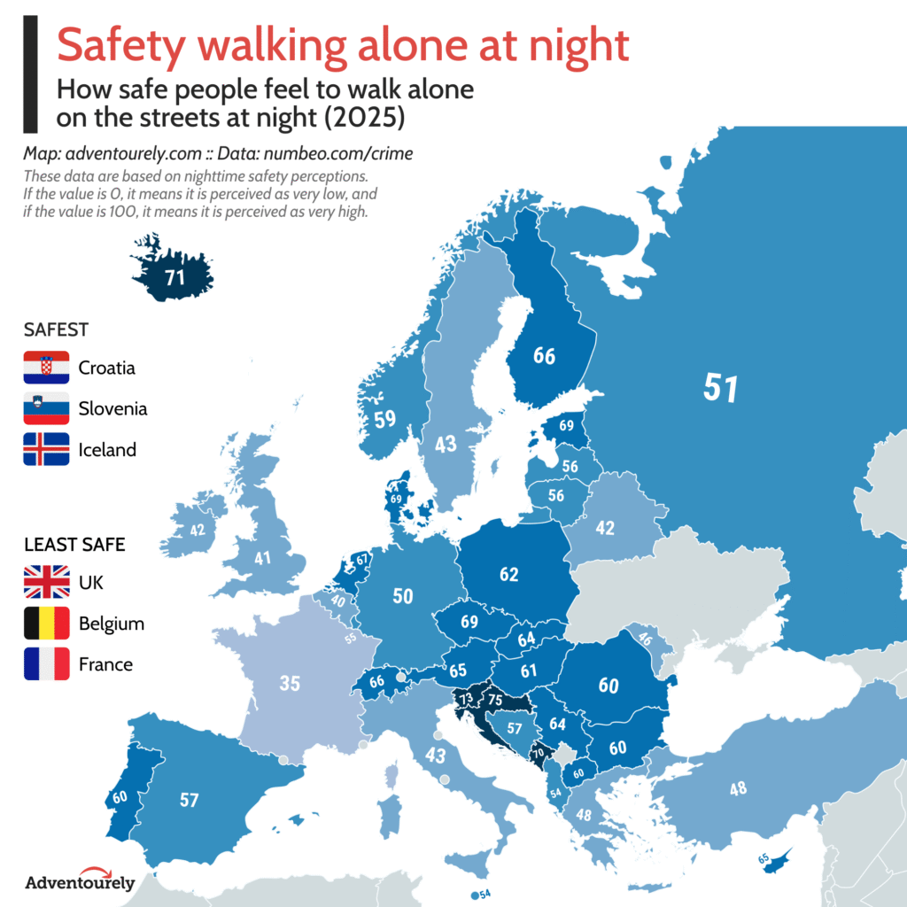 These nations lead the rankings, reflecting strong public confidence in safety and security measures. Notably, all top five countries are in Balkan peninsula or the Nordics, highlighting regional strengths in fostering personal safety at night.